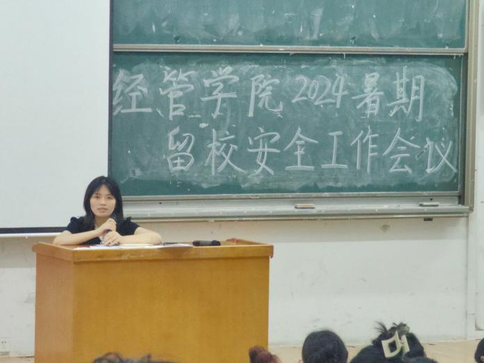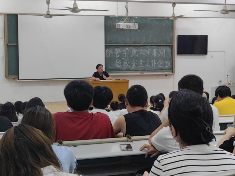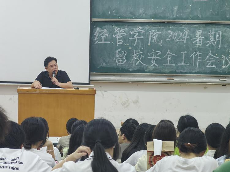 为保障经管学院在2024年暑假期间留校学生的生命财产安全,加强学院校园的安全管理,预防和减少各种安全事故的发生,2024年7月4日晚七点,经管学院在8T1教室召开针对留校学生安全工作的会议。本次会议由经济管理学院党委副书记刘思超和团委书记张雅倩主持,全体留校学生参加。