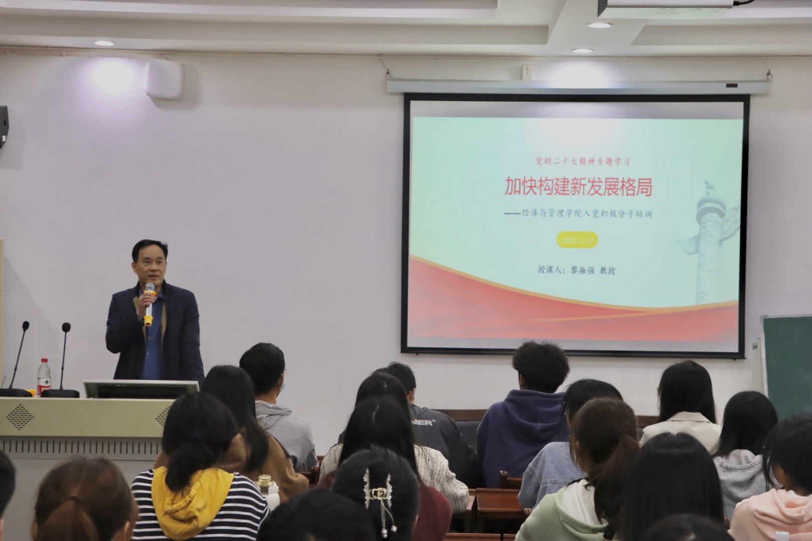 为深入学习贯彻习近平新时代中国特色社会主义思想,提高入党积极分子的政治觉悟与理论水平,5月10日晚7点半,经管学院在8301举行“加快构建新发展格局”党校第48期入党积极分子培训班第一次党课。经管学院党委书记黎振强以“加快构建新发展格局”为主题,为全体入党积极分子授课。