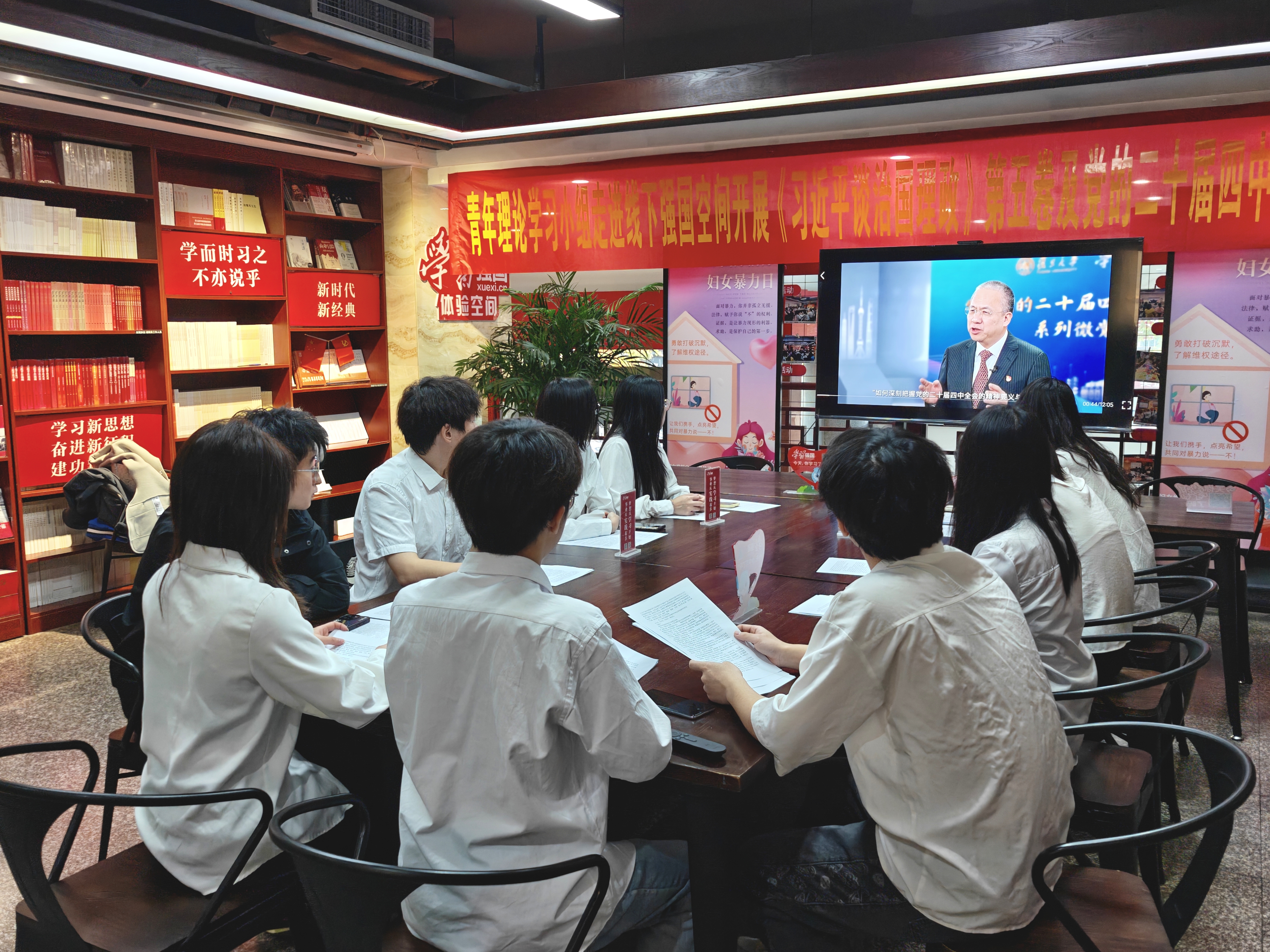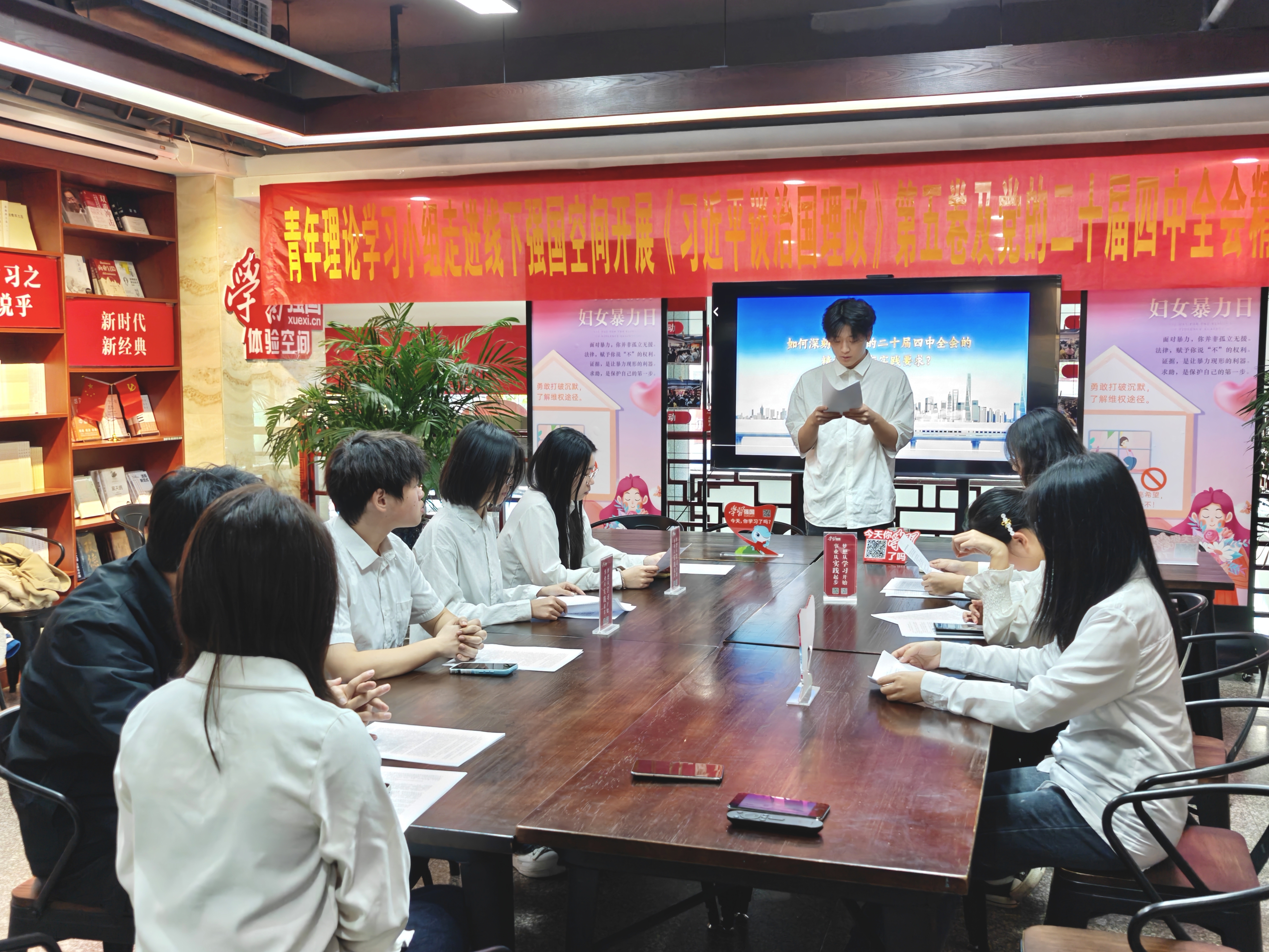 为推动青年学生党员、干部深化理论武装,切实把党的创新理论与会议精神转化为成长成才的行动自觉,11月30日下午,经管学院组织学生党员、干部代表走进岳阳市新华书店“学习强国”线下体验空间,开展《习近平谈治国理政》第五卷及党的二十届四中全会精神专题学习活动,以沉浸式学习筑牢思想根基。