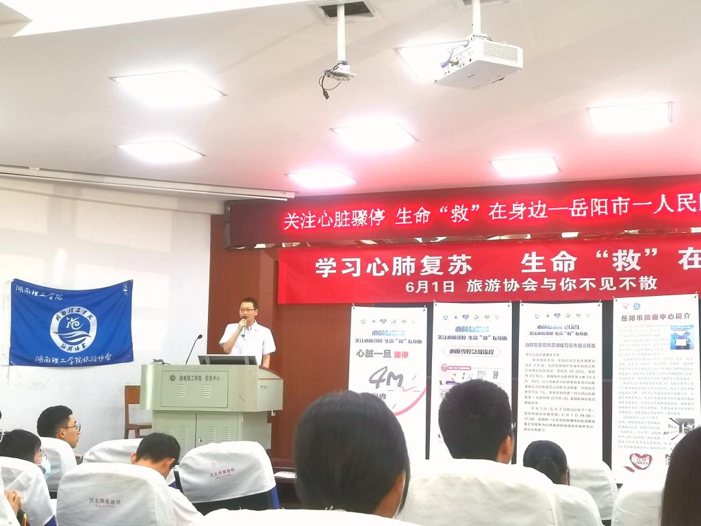 为加强同学们对突发事件的应急救治水平,更好地掌握急救知识与技能,6月1日下午,经管学院旅游协会联合岳阳市一人民医院胸痛中心专家团队,在六栋学术报告厅成功举办了以“学习心肺复苏,生命‘救’在身边”为主题的公益大讲堂。