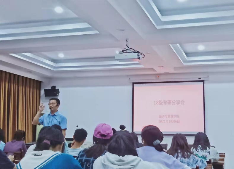 2021年10月6日晚上七点半太阳网集团tcy8722,在8301教室开展了18级考研答疑分享会。经管学院院长周金城、专任老师王俊、18级辅导员单芳以及各学院部分应考生出席了本次答疑活动。