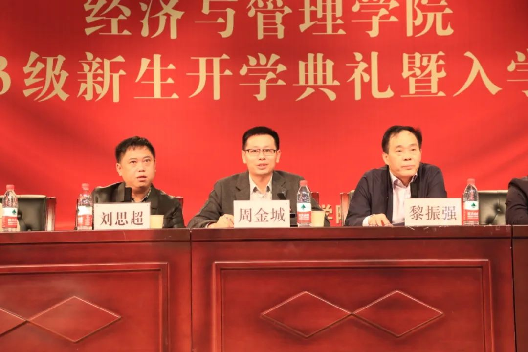 经管学院院长周金城致辞。他代表经管学院对新生表示热烈欢迎。在介绍学院的基本情况后,他强调涵养家国情怀,筑牢人生根基的重要性。呼吁新生用责任和智慧投身于强国建设的火热建设。同时向新生提出建议:应理论与实践同行,练就过硬本领,彰显担当作为,锤炼向上向善的优良品格。他希望同学们能够真正理解到“修身齐家治国平天下”的内涵,从自身出发,提高身体素质,以最饱满的姿态阔步走向自己的未来,从而更好回馈祖国。