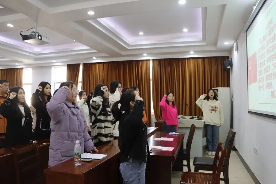 大会伊始,全体起立,奏国际歌。由院学生党支部书记田亚玲宣读批复,全体预备党员在院学生支部书记单芳的带领下宣誓,面对党旗肃立,庄严的举起右手,大声宣誓。