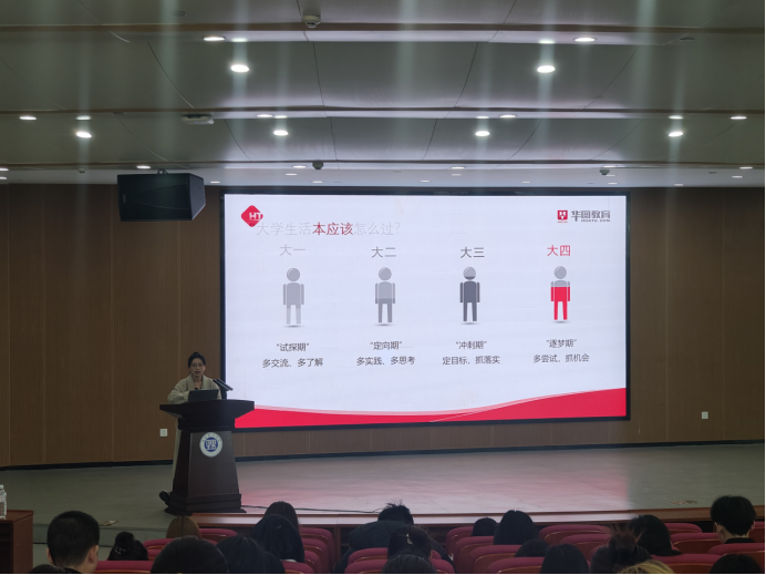 讲座开始,华图教育谭老师通过人格测验小游戏引入人生规划主题,简要分析五个阶段的递进性,指出大学四年学生应当提前合理规划时间,认真打好基础,珍惜应届生身份,做好职业规划。她大致介绍关于公务员、各省事业单位、银行的考试要求和考试时间。对目前考公考编的整体形势进行了剖析,根据历年的报考人数和录取人数的竞争比,指导大家怎么样去对待考编,以及应届生考编优势。并结合自身多年经验和体会与在场同学进行互动交流,详细解决了同学们提出的问题,强调了把握机会的重要性和面对人生岔路口的应对措施。