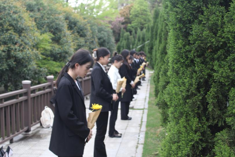 默哀结束后,张雅倩老师带领团学成员和党员代表上前,向烈士纪念碑敬献花束,表达对他们的崇高敬意和衷心感激。