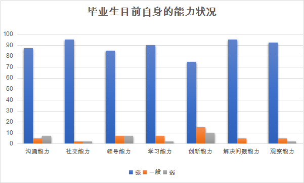 调研数据显示,毕业生当前在社交能力、解决问题能力、观察能力和学习能力方面较强,而在沟通能力、领导能力和创新能力方面比较弱,尤其是创新能力欠缺,有待进一步加强。