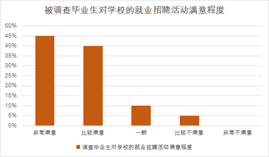 (2)对学校就业工作满意度评价:调查者对学校就业指导课程内容设置的满意度、毕业生对学校就业工作整体满意度、毕业生对学校举行的各类就业招聘活动满意度、学校办理毕业生就业手续满意程度、毕业生对学校的就业宣传满意度等。