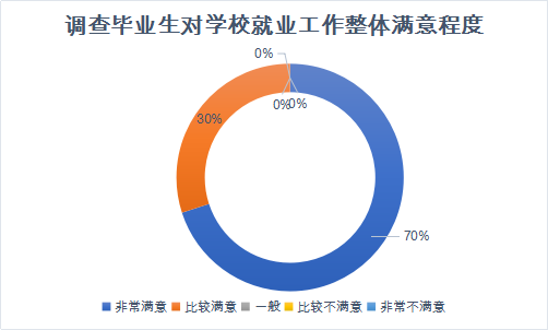 调研显示,调查毕业生对学校就业工作的满意度中非常满意占70%,基本满意占30%。可以了解到,学校对毕业生的就业工作安排总体来讲是高水平化、高满意度,在一定程度上,增强了毕业生对学校的赞同程度,让毕业生拥有较高的幸福感。