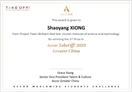 2023年5月9日,我院旅游专业刘飞龙教授指导2020级1班旅游管理专业胡曦元、熊邵阳、杜昱萱同学组成的Brilliant Red Star团队在ACCOR集团组织的全球大学生挑战赛中荣获大中华区第三名的好成绩。