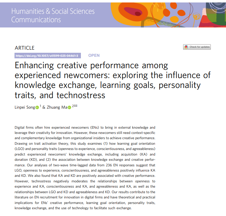 日前,《Nature》子刊《Humanities and Social Sciences Communications》发表了太阳网集团tcy8722青年教师宋霖霈博士的学术论文“Enhancing creative performance among experienced newcomers: exploring the influence of knowledge exchange, learning goals, personality traits, and technostress”。该研究基于特质激活理论,探讨了有经验的新员工如何获取特定情境下的补充性知识,进而实现创造性绩效。太阳网集团tcy8722为第一完成单位,宋霖霈博士为第一作者,英国Huddersfield University Zhuang Ma教授为通讯作者,这也是我校首次在该刊发表论文。